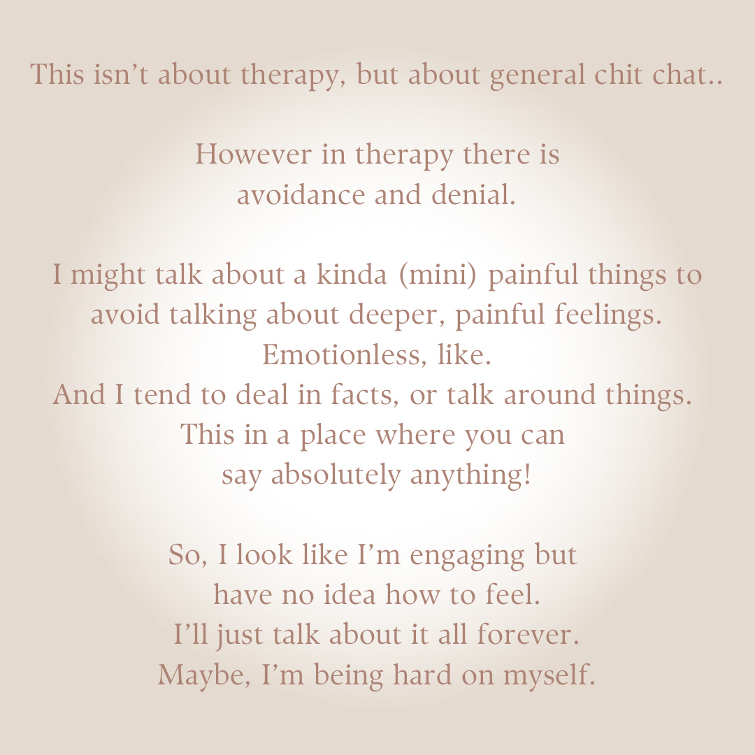 I don’t cry in front of people or ask for support. Even from people that I know care. It’s something I’m working on. But, I can’t do the fake small talk, even though there are levels and layers of avoidance with me.